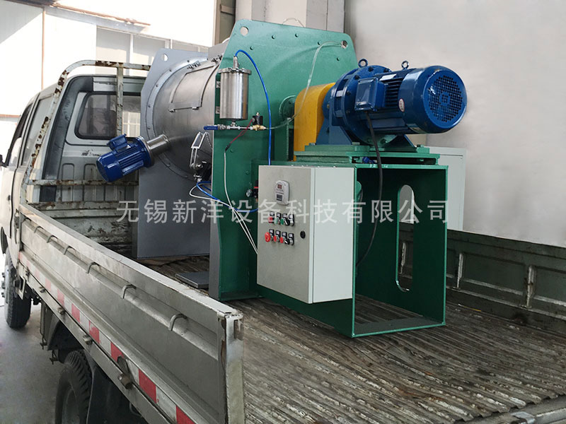 該機型由傳動機構、臥式筒體、犁刀、飛刀四部分組成。物料在犁刀作用下沿筒壁作對流運動,當物料流經飛刀時被高速旋轉的飛刀拋灑,從而在較短時間內達到均勻混合。能滿足大多固液混合以及造濕粒、干燥等復合工藝。